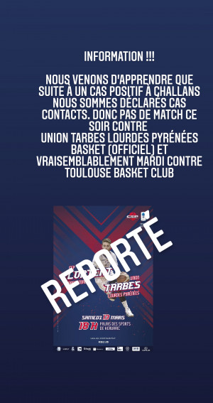 13 mars 2021 Pro INFORMATION !!! Nous venons d’apprendre que suite à un cas positif à Challans nous sommes déclarés cas contacts. Donc pas de match ce soir contre Union Tarbes Lourdes Pyrénées Basket et vraisemblablement mardi contre Toulouse Basket Club
